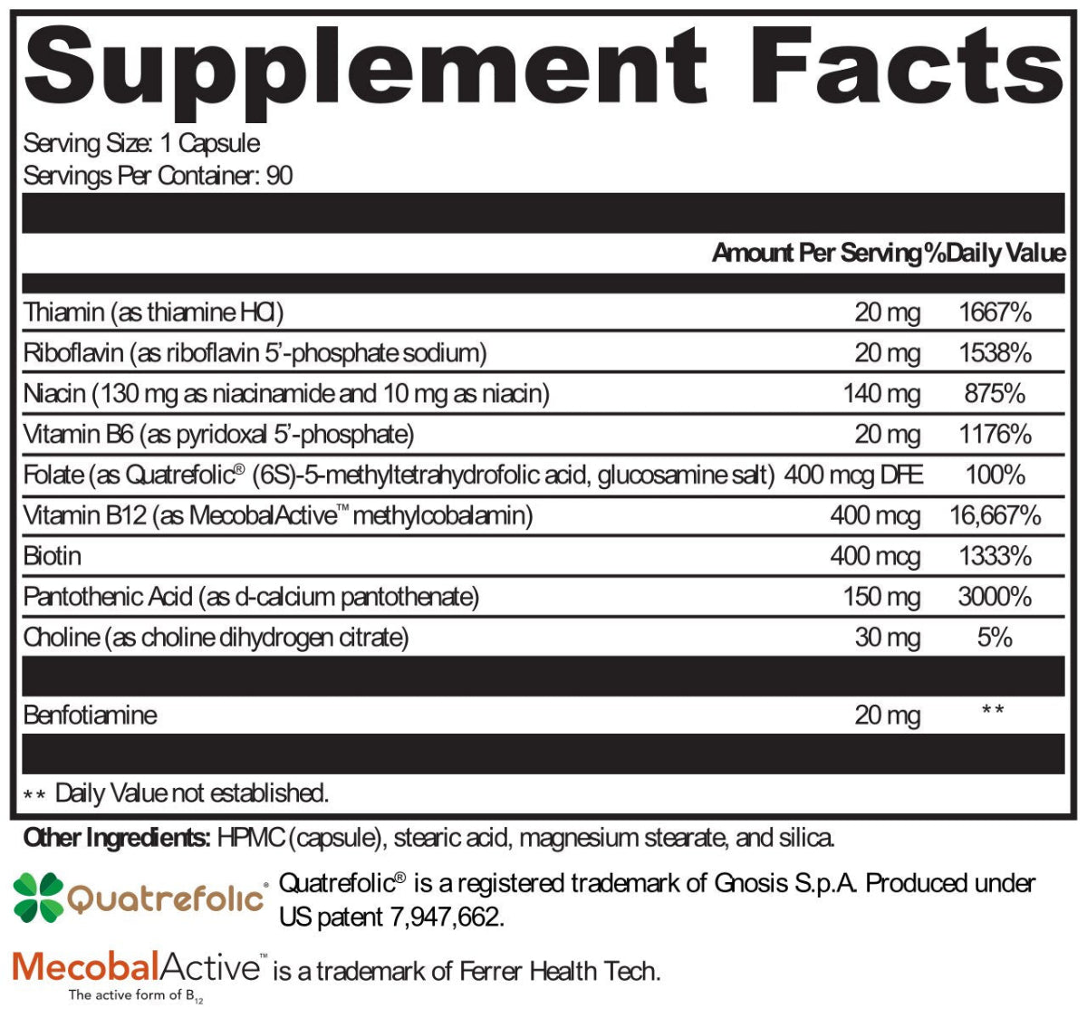 | Folate (as Quatrefolic (6S)-5-methyltetrahydrofolic acid, glucosamine salt) | 400 mcg DFE | 100% |