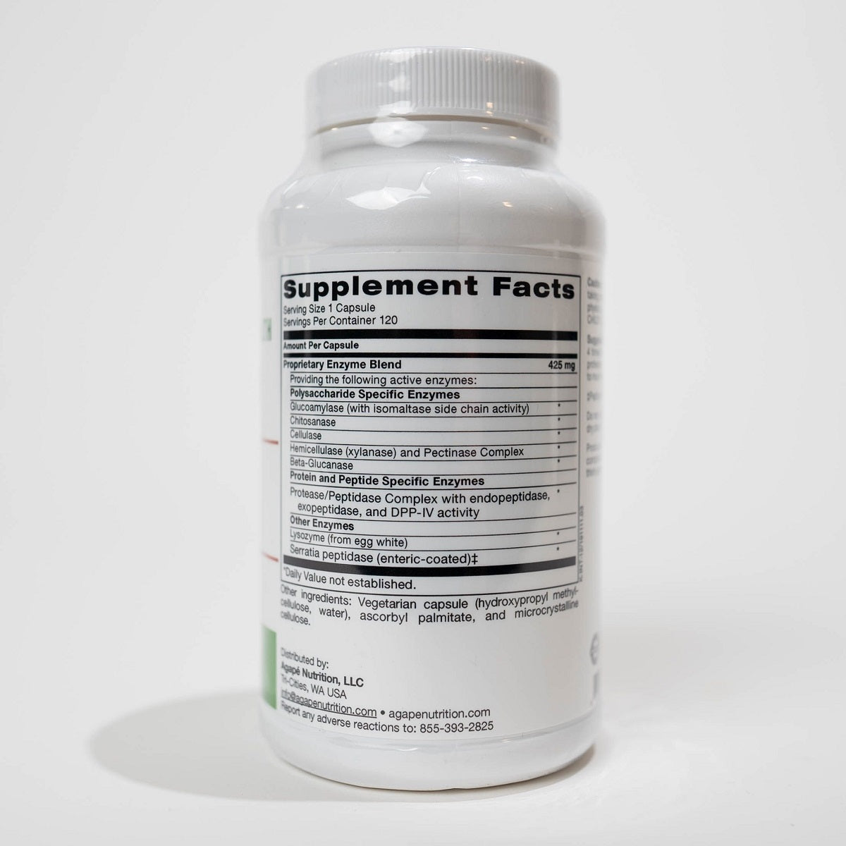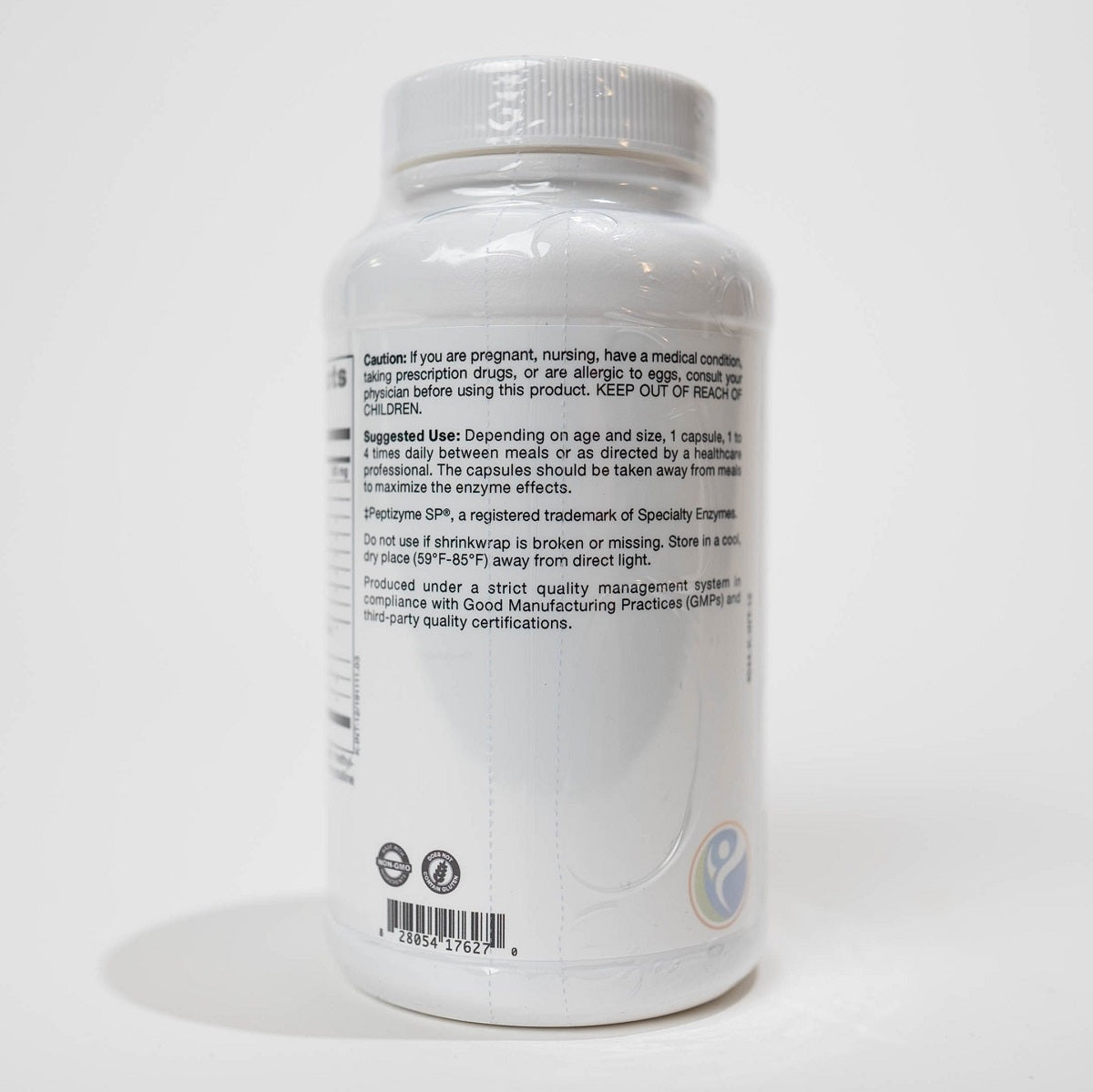 Depending on age and size, 1 capsule, 1 to 4 times daily between meals or as directed by a healthcare professional. The capsules should be taken away from meals to maximize the enzyme effects.