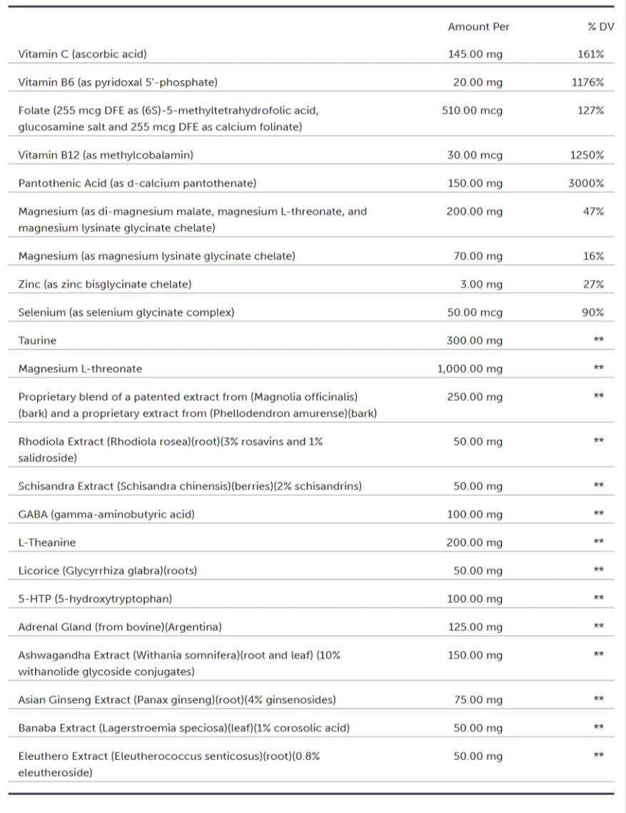 | Proprietary blend of a patented extract from (Magnolia officinalis) (bark) and a proprietary extract from (Phellodendron amurense) (bark) | 250 mg | ** |